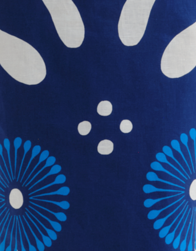 - Artisanal blue geometric statement print.