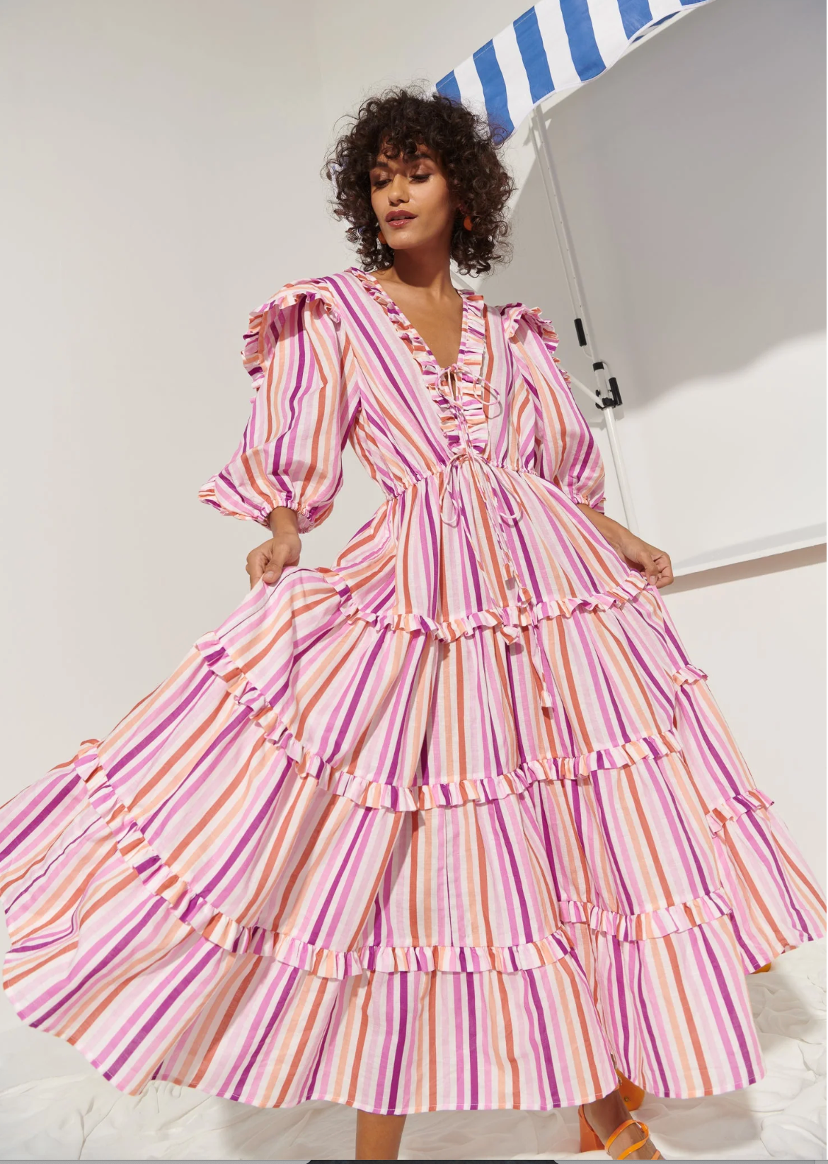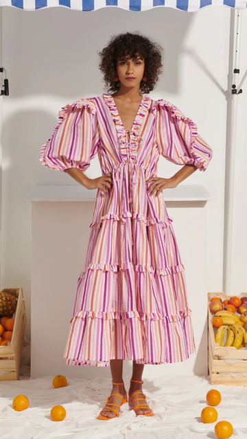 Step out in stripes in this linen and cotton mid-calf number. The tiered skirt has little ruffles at each tier, pockets and full detailed sleeves to your elbow. Ties at the v-neck and an elastic waist keep you comfortable while stylish. Pinks and coral stripes.