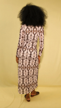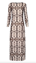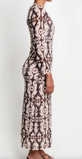 A modern column silhouette crafted in stretch mesh, the Nella Dress is designed for an elongated, streamlined fit. Lined for comfort and ease, it features an all-over maxi paisley print that makes a bold yet refined statement. Long sleeves and a high neckline balance the striking pattern with understated structure.