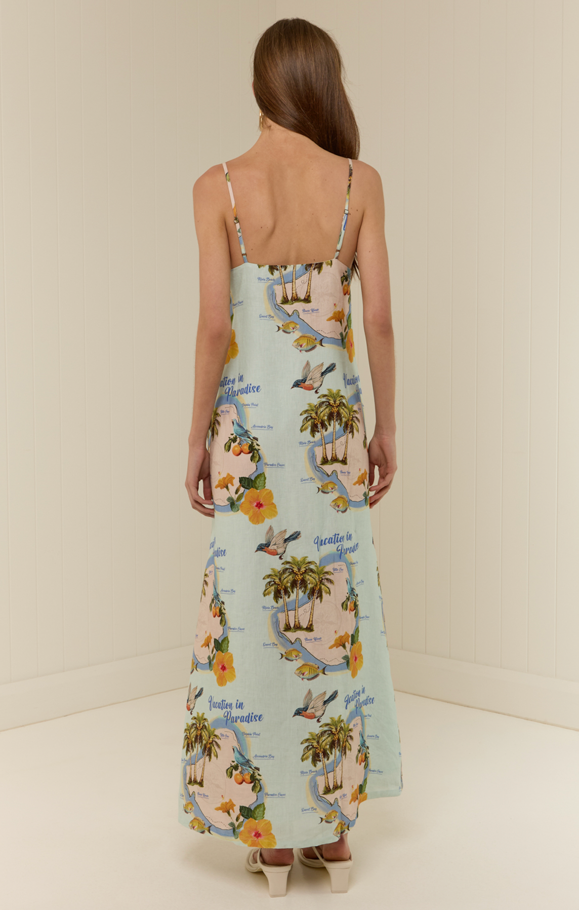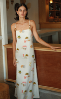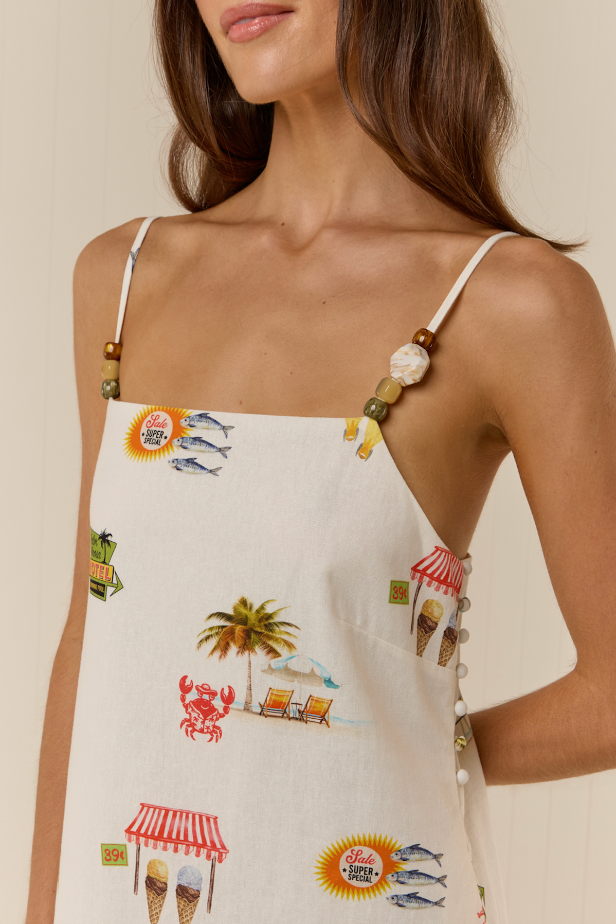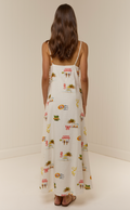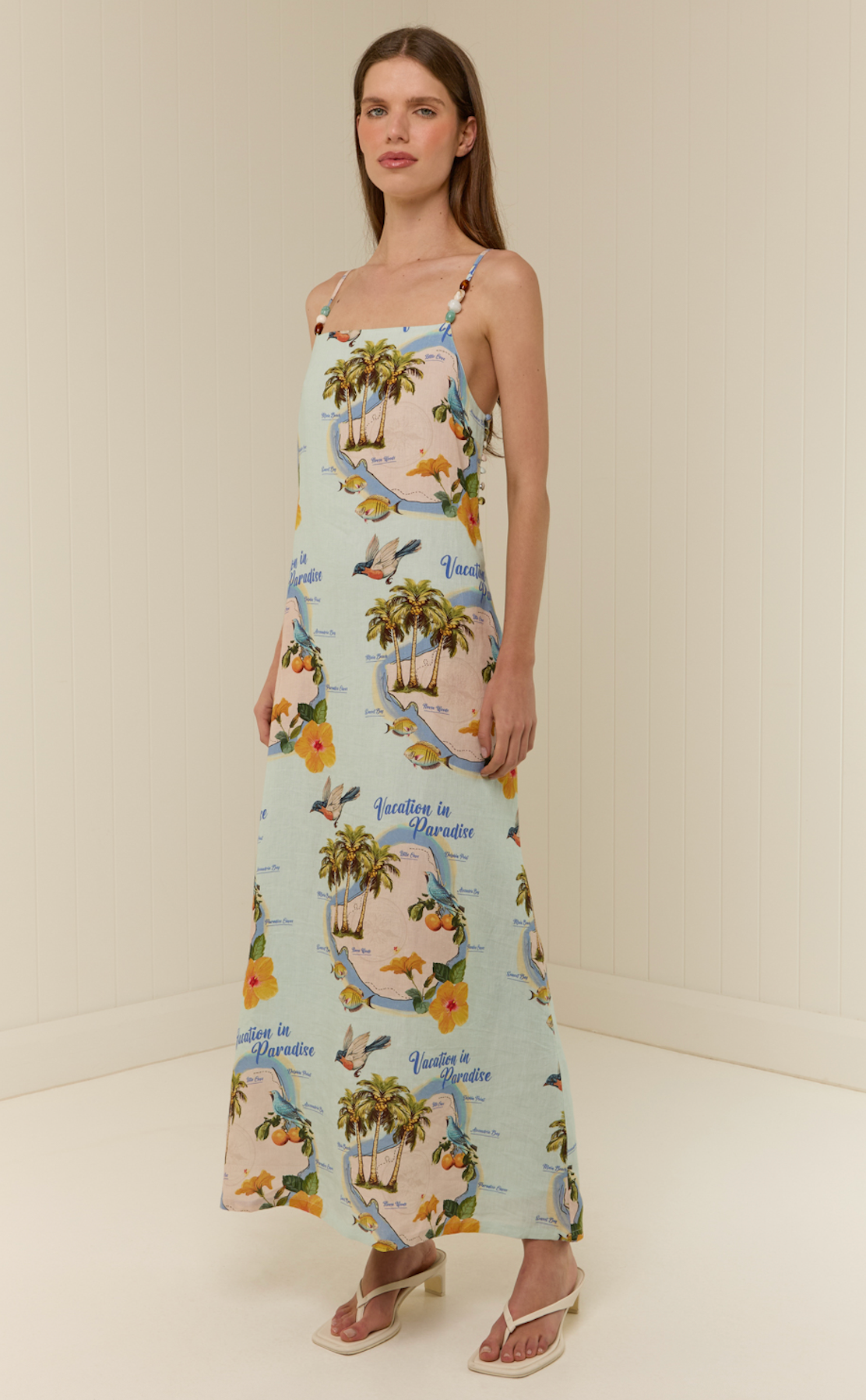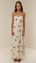 The Hidal Dress is crafted from a premium Linen blend, printed in the exclusive Tropicana or Palm Paradise print. Designed with a straight neckline and thin adjustable straps, it features asymmetrical bead detailing for a fun yet elevated finish. This sweet dress is a straight maxi silhouette designed to hang loosely from the body and is finished with a side button opening detail.
