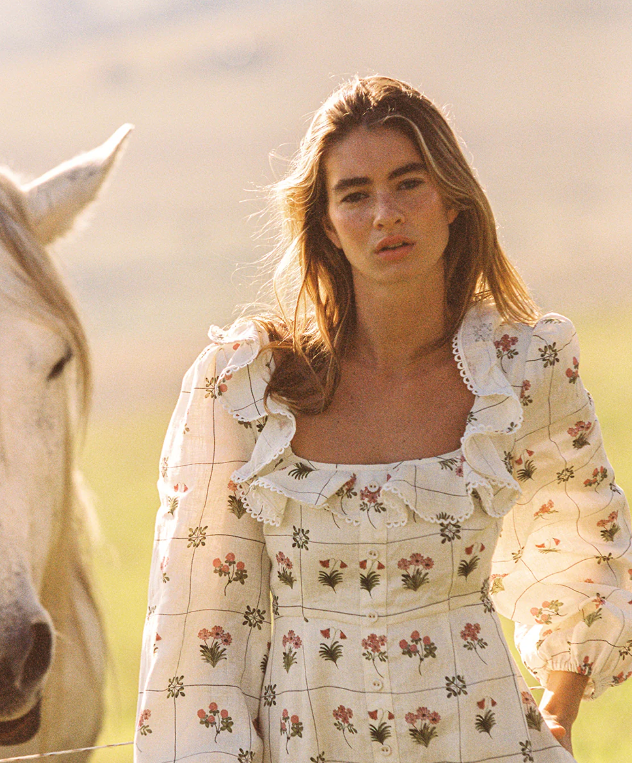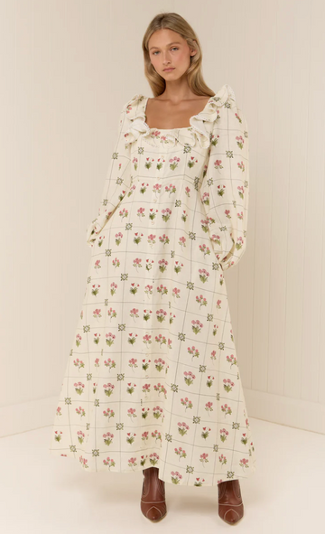 The Montana Dress in an exclusive Flower Ceramics print, crafted in a premium Linen. This sweet dress has a fitted bust and waist, with a flowing A-Line skirt. Featuring mock centre front button detailing, full length sleeves and a detailed square neckline.