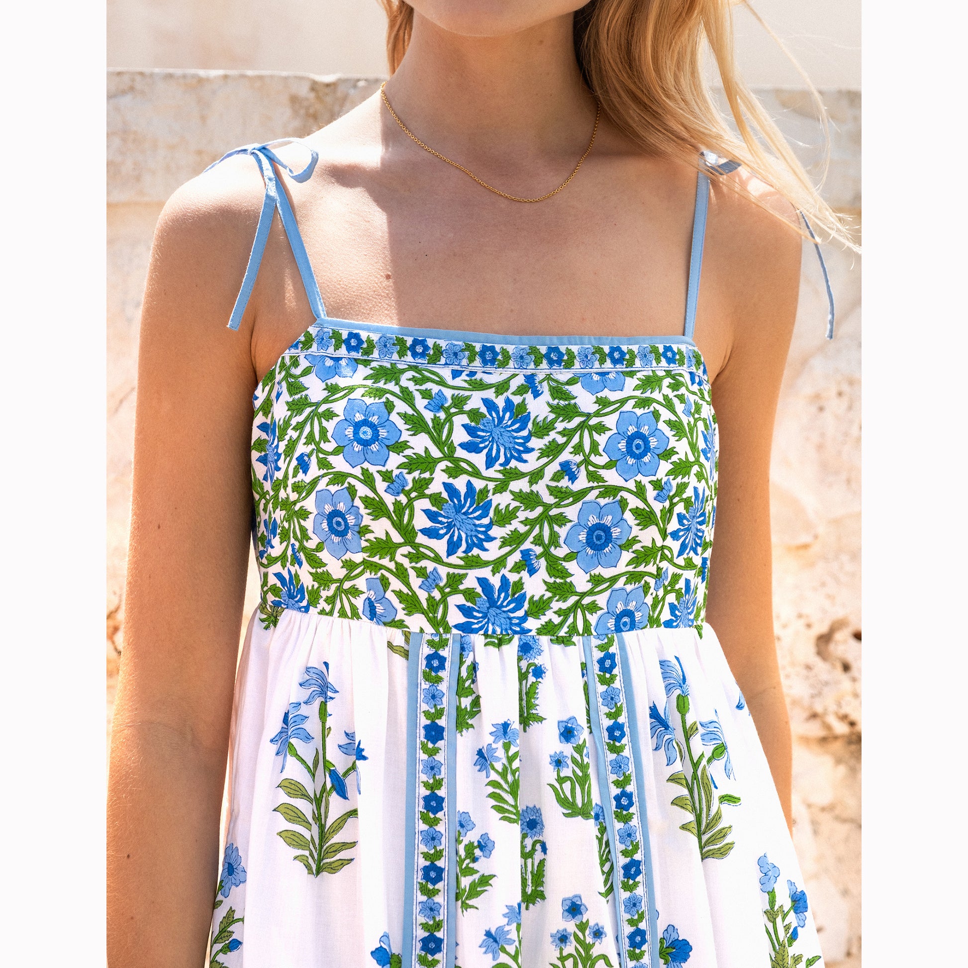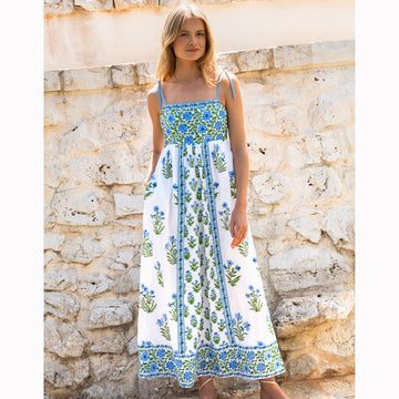 Hand-block printed on organic cotton, this elegant dress features a crisp white base with serene shades of green and blue. We love the pretty mix of block printed florals and borders. Delicate tie straps add a feminine touch, while the flowing silhouette makes it perfect for warm summer days. Light, breezy, and effortlessly chic.