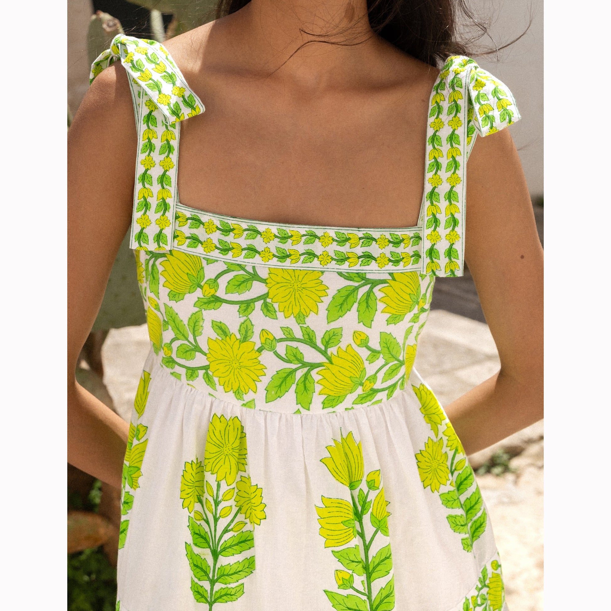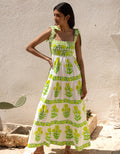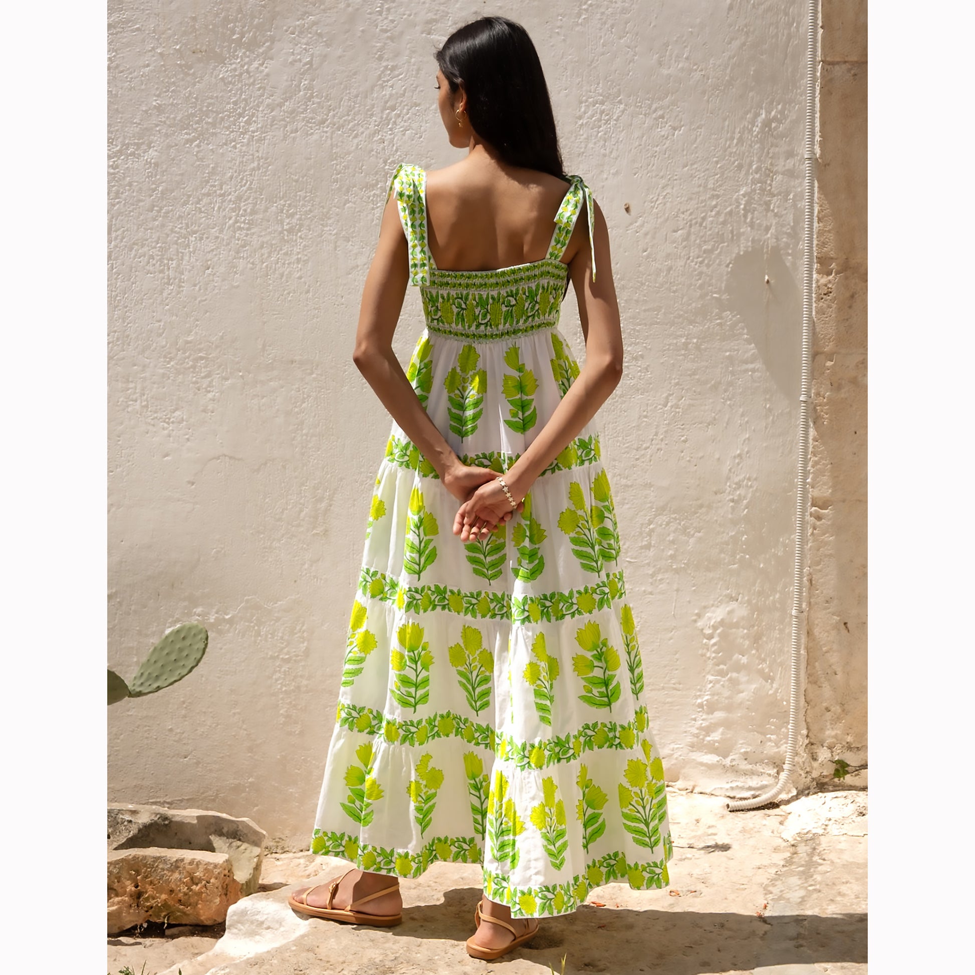 A gorgeous new style in organic, block-printed cotton, the Lara Dress is designed for a flattering yet effortless fit. Featuring a fitted bust with smocking at the back for comfort, adjustable tie straps, and a floaty maxi skirt. The tiered design is finished with a bold border and striking oversized buta motifs in lush shades of lime and green. Fully lined for a beautiful drape - an easy, breezy summer dream.
