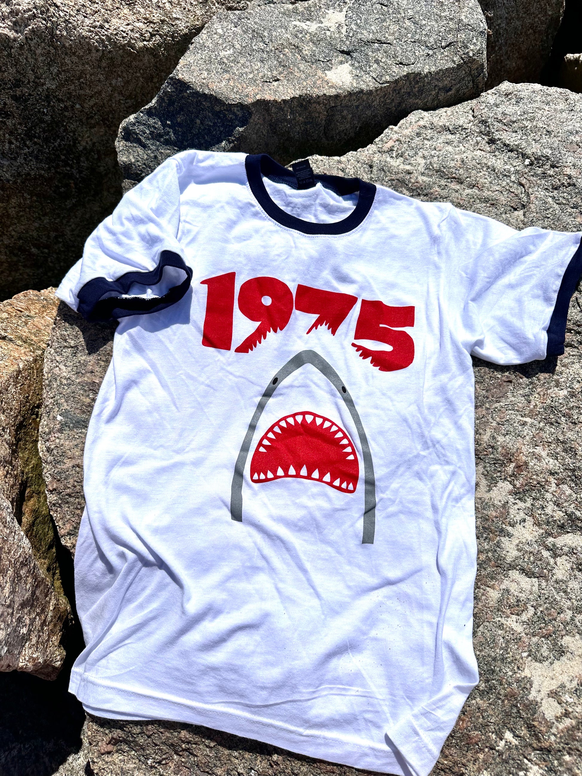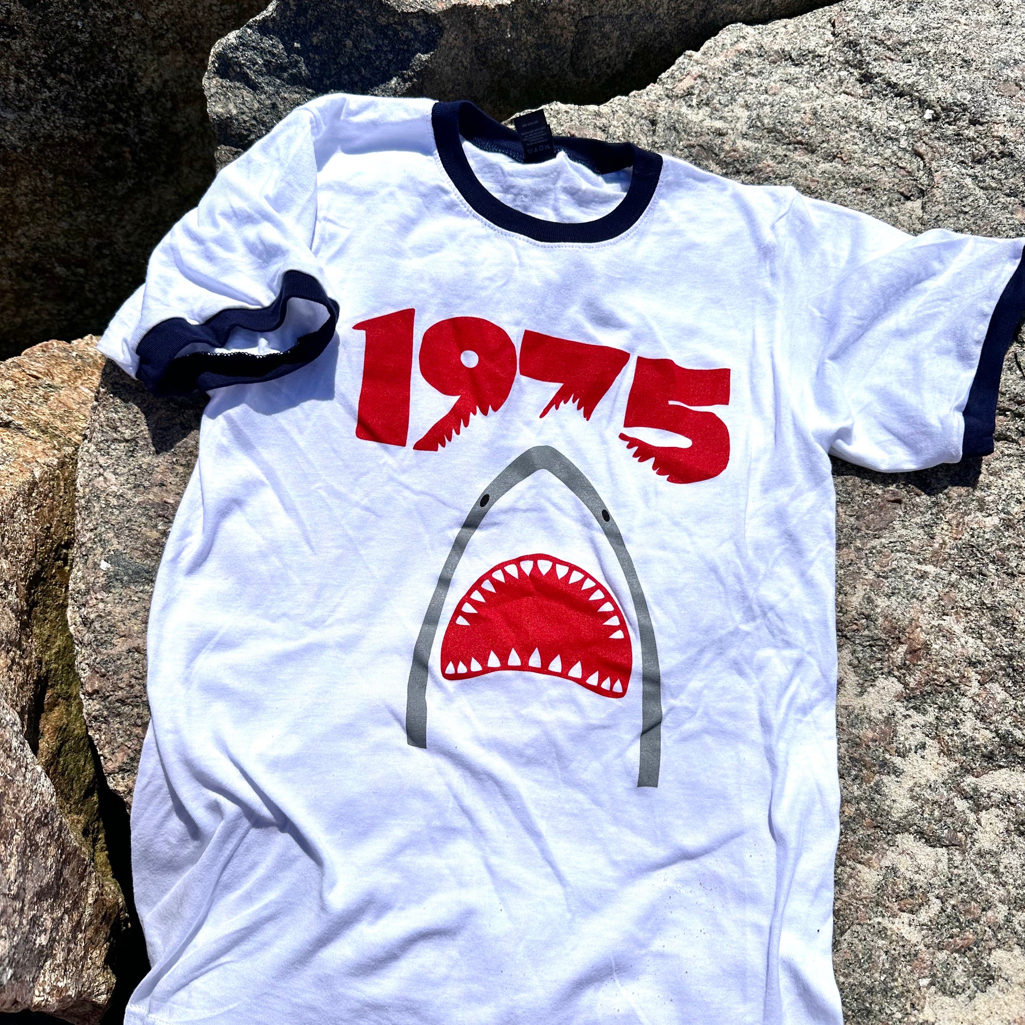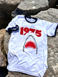 We love the contrasting collars on our 100% cotton 1975 T-shirts. Wear yours proudly and remember the first time you ever watched JAWS then were terrified to go in the water, even a pool.