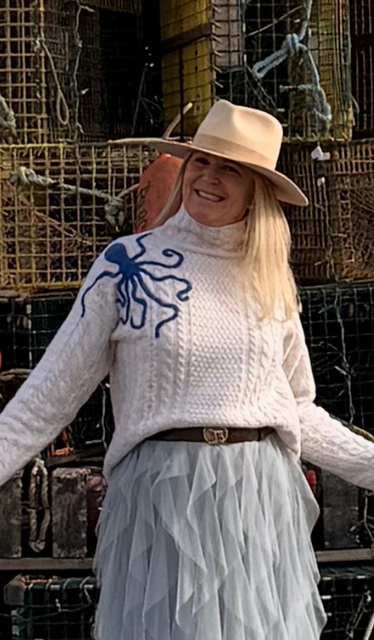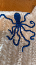 We are knitting REMY's latest sea creature inspired 100% cashmere sweater. Our sweet "Ocho" is sitting on your shoulder in lapis with turquoise suckers. The knit is our thickest and designed with a unique cable pattern with a slight turtleneck style. The hem is stitched straight to be worn out or with the stylish "front tuck" to show your waist.