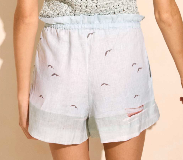 Embrace the spirit of summer with the Solange Linen Track Shorts. Expertly crafted from premium, breathable linen, these shorts feature hand-illustrated maritime scenes—lighthouses, sailboats, and birds in flight—in a soft watercolor palette or choose the feather composition print inspired by TABAY’s heritage.